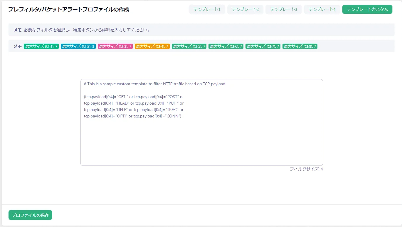 プレフィルタは、MacアドレスやIPv4/IPv6アドレス、プロトコルタイプ、TCP/UDPポート番号などの基本的なフィルタに加え、パケットの任意のオフセットに対して任意の値(Hex, Bit)を適用することが可能です。