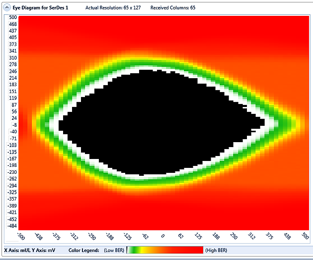 BERアイダイアグラムは、RXを平衡化した後、信号品質の直接的なビジュアル化を提供します。アイダイアグラムは、PHYのステップバイステップにより得られたサンプリングポイントから時間軸(標本化遅延)と振幅軸(0/1閾値設定による)を変化させる事で生成されます。